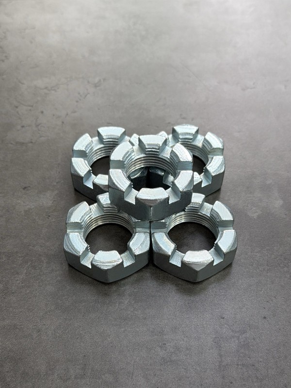 Гайка М24х1,5 корончатая, мелкий шаг резьбы. Гайка российского производства. Артикул: 853514. Применяемость: гайка рулевого пальца КАМАЗ. Диаметр резьбы: 24 мм. Шаг резьбы: 1,5. Высота: 20 мм. Размер "под ключ": 36 мм. Высота от опорной поверхности до основания прорези: 14 мм. Покрытие: цинк.