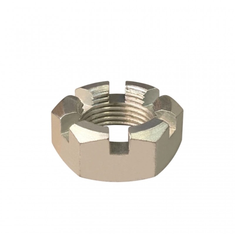 Гайка М24х1,5 корончатая, мелкий шаг резьбы. Гайка российского производства. Артикул: 853514. Применяемость: гайка рулевого пальца КАМАЗ. Диаметр резьбы: 24 мм. Шаг резьбы: 1,5. Высота: 20 мм. Размер "под ключ": 36 мм. Высота от опорной поверхности до основания прорези: 14 мм. Покрытие: цинк.